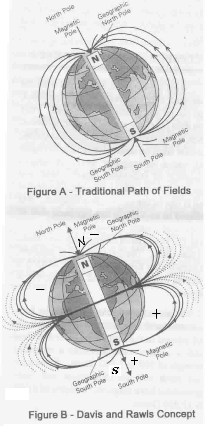 Continuing his work into the 1970’s Albert Roy Davis joined forces with Walter Rawls. Davis and Rawls broke a lot of ground together, much of their work still not recognized by the mainstream scientific community. After documenting the different energies of the two poles, they also discovered that any magnet creates a figure eight field, not the typical torus that most of us are familiar with (See Figure to the left). They discovered that magnetic energy flows out of the south pole and into the center of the magnet and then flows out of the center and up to the north pole. The image we are most familiar with – the apparent field demonstrated when iron filings are placed near a magnet – is not the field of the magnet itself. Each filing becomes a mini-magnet when placed next to a magnet and line themselves up according to standard polar attraction/repulsion.